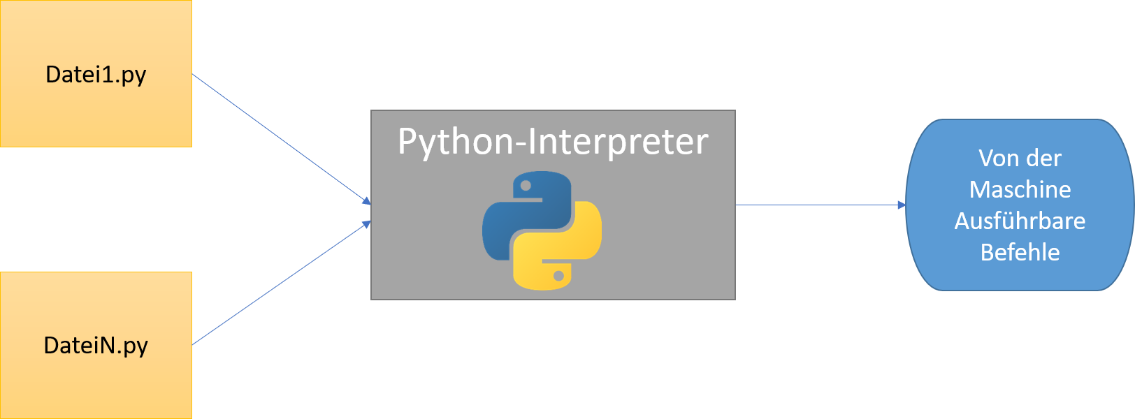 Wir schreiben unsere Programme (d.h. Funktion, Prozeduren, Datenstrukturen) in eine oder mehrere Textdateien. Typischerweise schreiben wir solche Textdateien mit einem Texteditor. Um das Programm auszuführen, rufen wir dann den sogenannten Python Interpreter auf. Dieser liest die Anweisung in einer angegebenen Datei und führt diese nacheinander aus. Dabei werden auch Funktionen, Prozeduren und Datenstrukturen berücksichtigt, die womöglich in anderen Dateien definiert wurden.